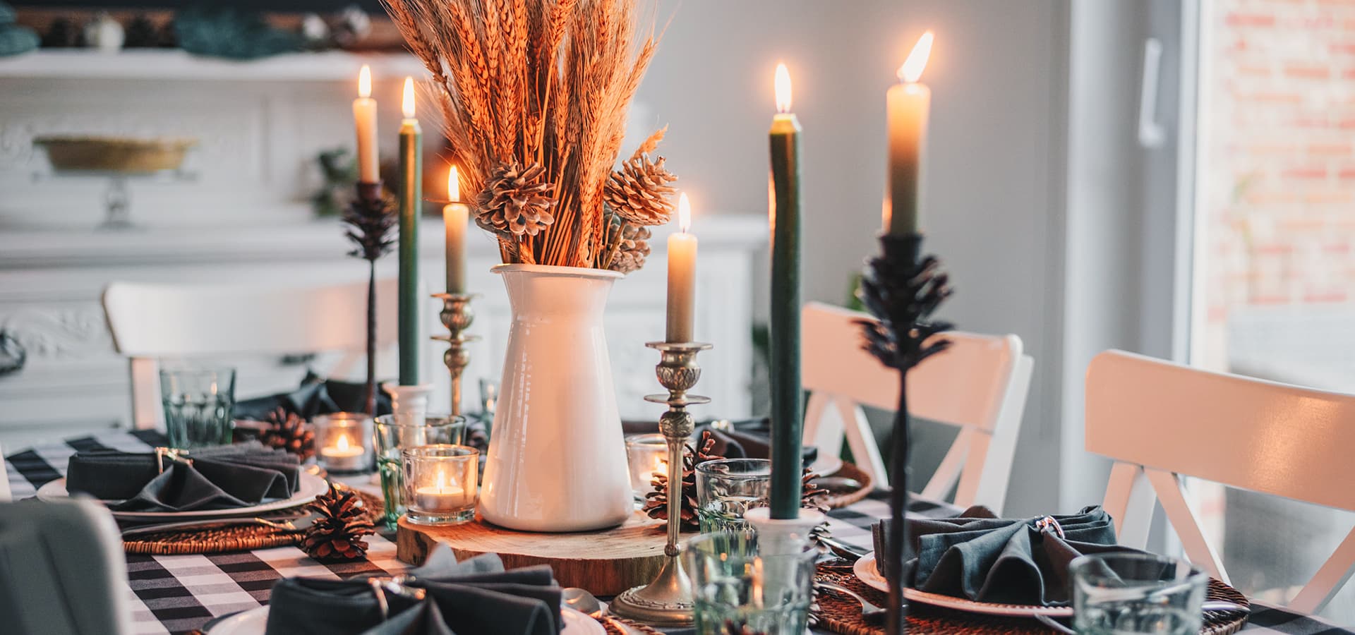 Bring the feeling of fall to your dining table with votive candles, and beautiful bouquets. Make it modern with a silver platter filled with white gourds. Go vintage with antique glassware and fall foliage like dried corn. Get creative with platters or table runners you already own.