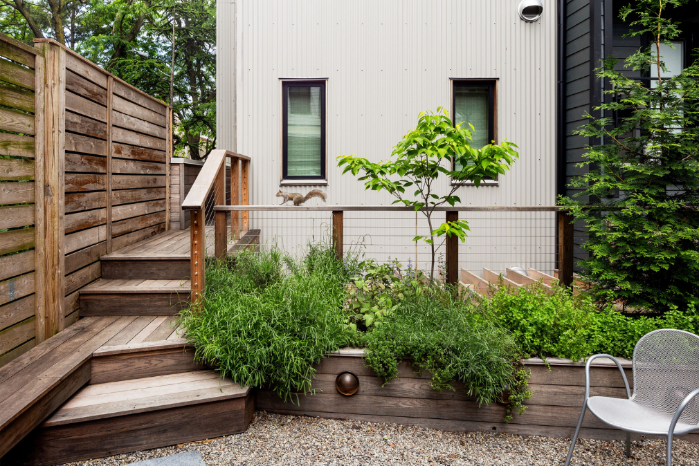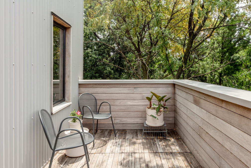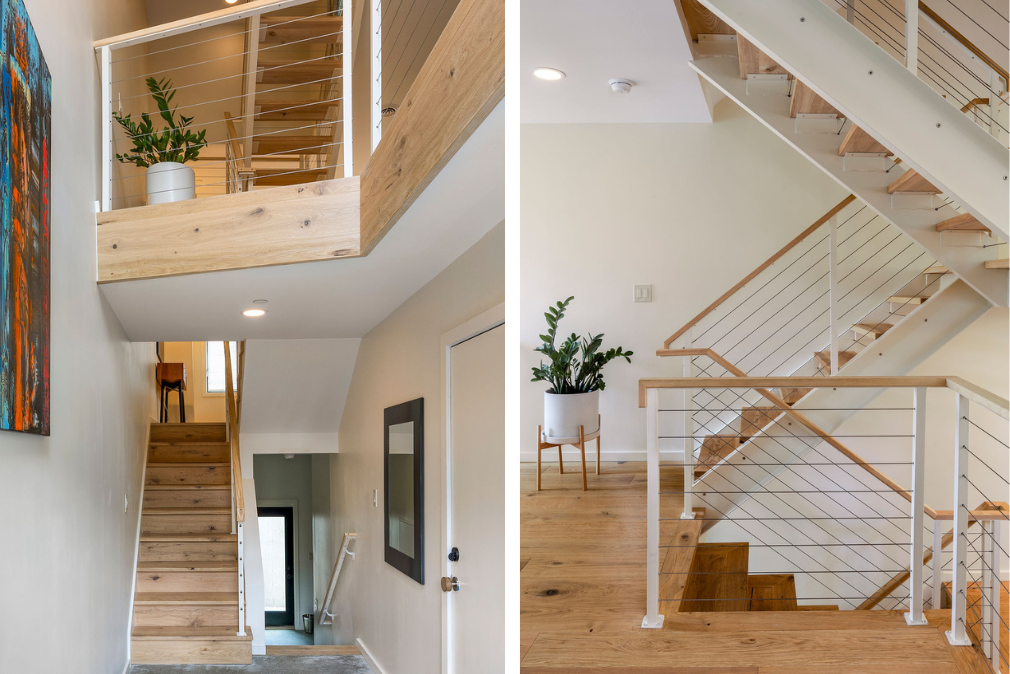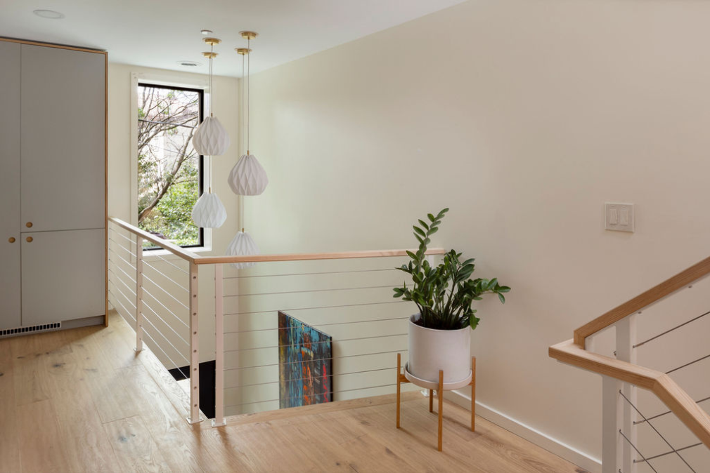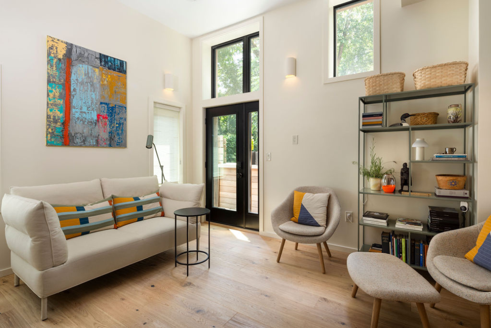 Despite the home’s 18-foot width and total of 1,675 square feet of conditioned living space (excluding the garage), the four-bedroom, three-bathroom home does not feel like a traditional rowhouse. The well-lit interiors feel spacious and serene, and evoke a rare sense of quiet and calm in a dense urban environment.