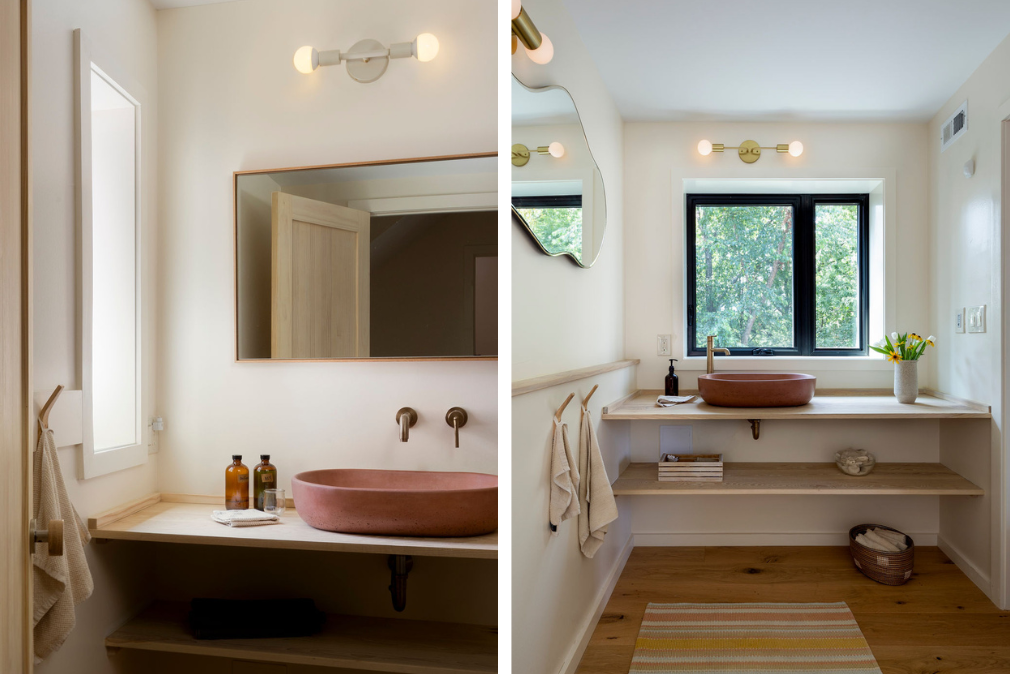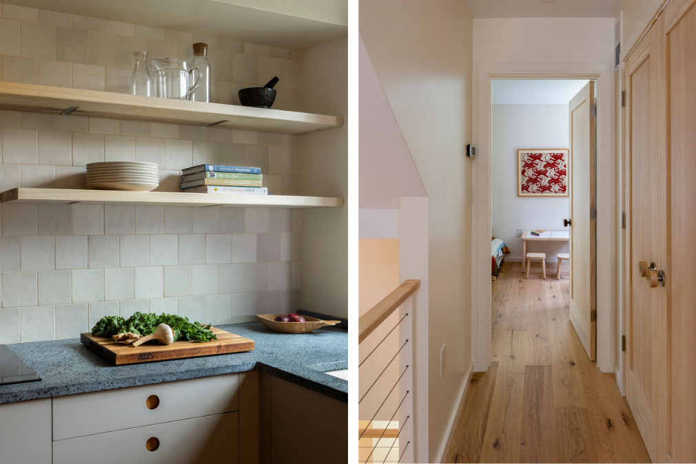 I love all the natural materials that were embraced by our clients—the stained wood doors and doorknobs, concrete vessel sinks on simple ash vanities, floating ash shelves in the kitchen, a soapstone countertop left unfinished so it will naturally patina, and stained concrete in the entry. The materiality of the house is simple and honest.